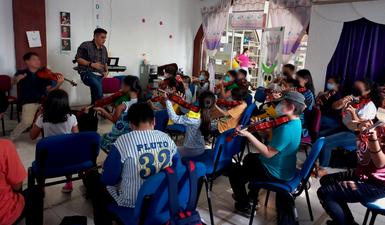 Explicó que el instrumento se les prestará a los niños para que se lo lleven a su casa, porque el proyecto busca impulsar diferentes valores como es la responsabilidad de cuidar su instrumento, ver la limpieza, la constancia para poder estudiar también en casa, y mientras los niños están en el proyecto, ellos pueden conservar el instrumento.
