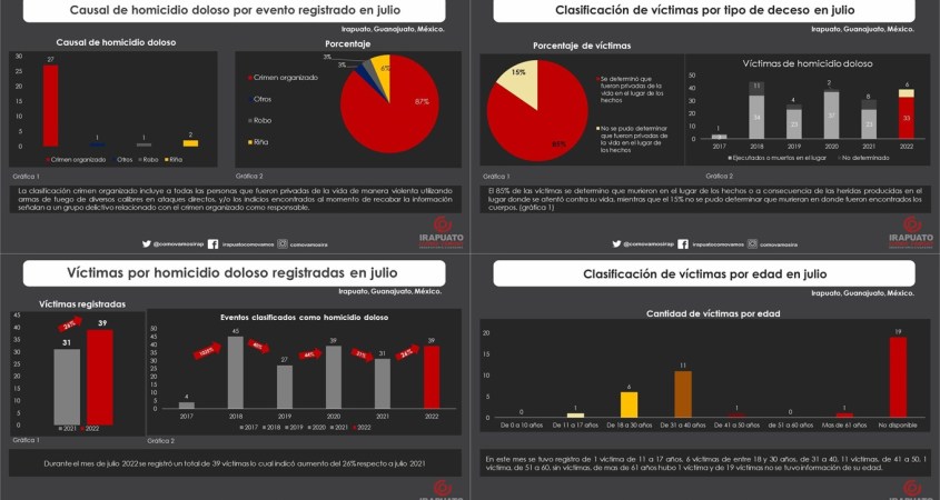 El reporte mensual de víctimas por homicidio doloso presenta la información condensada del registro de víctimas y eventos acontecidos en el municipio de Irapuato, Guanajuato.