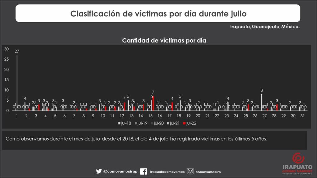 Durante julio 2022 acorde a nuestro registro de víctimas por homicidio doloso existió recuento de 31 eventos donde se registró un total de 39 víctimas.