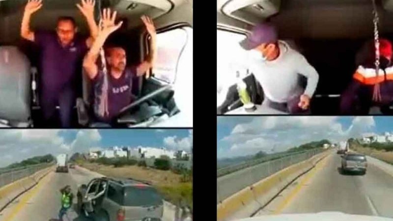 En las imágenes, que parecen salidas de una película de acción, se aprecia el momento en el que dos hombres viajan con tranquilidad a bordo del vehículo, cuando de repente aparecen frente a ellos dos camionetas de las que salen sujetos fuertemente armados y los obligan a detenerse.