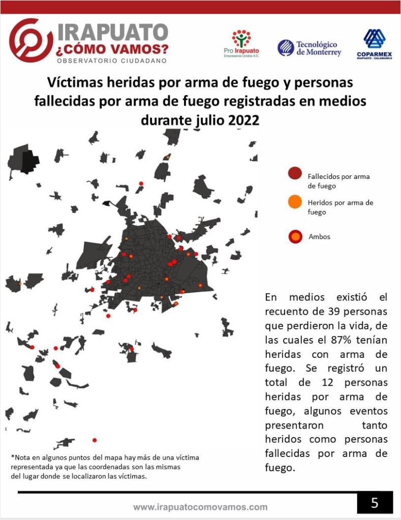 Irapuato, Guanajuato. Durante el mes de julio se registró en medios de comunicación que 41 personas perdieron la vida clasificada en homicidio, 39 clasificadas en doloso y 4 clasificadas en culposo.
