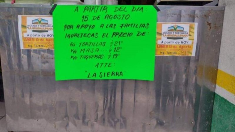 En redes sociales fueron compartidas las fotografías en las que se observan las cartulinas afuera de las tortillerías con los nuevos precios de tortilla, masa y un costo especial a taqueros, las cuales fueron firmadas por “La Sierra”, nombre con que se conoce al Cártel de la Sierra o «Los Tlacos».
