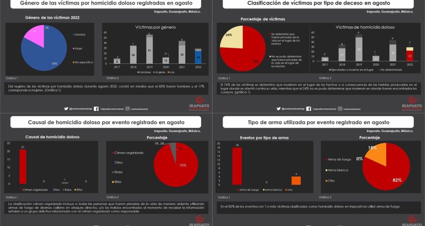 El reporte mensual de víctimas por homicidio doloso presenta la información condensada del registro de víctimas y eventos acontecidos en el municipio de Irapuato, Guanajuato.