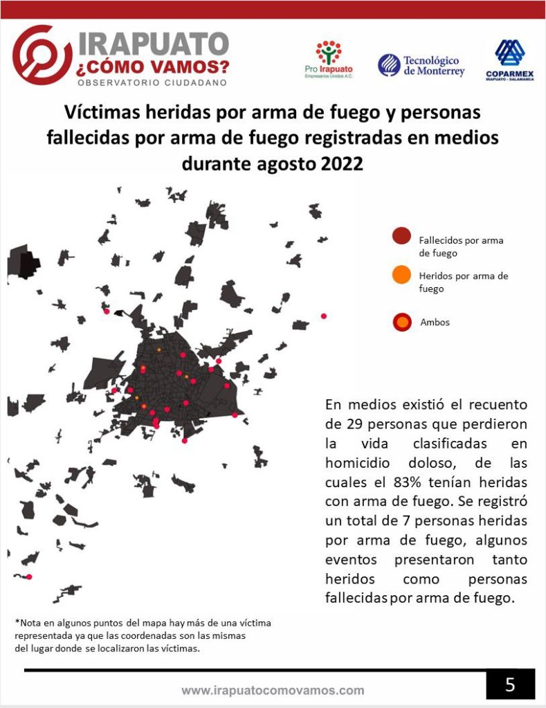 Irapuato, Guanajuato. Durante el mes de agosto se registró en medios de comunicación que 34 personas perdieron la vida clasificada en homicidio, 29 clasificadas en doloso y 5 clasificadas en culposo.