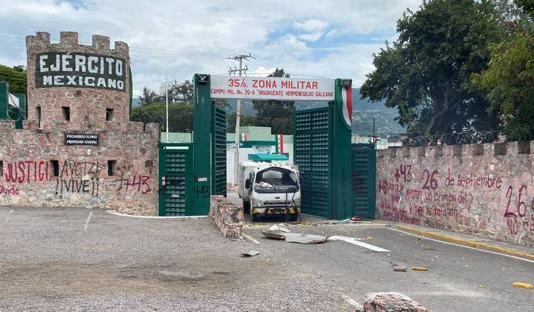 Durante una protesta a ocho años de la desaparición de los 43 estudiantes de Ayotzinapa en Iguala, normalistas arremetieron contra la las instalaciones de la 35 Zona Militar en Chilpancingo, Guerrero.