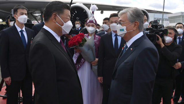 La oficina del presidente kazajo, Kassym-Jomart Tokayev, le mostró saludando a Xi en el aeropuerto, ambos líderes con cubrebocas blancas.