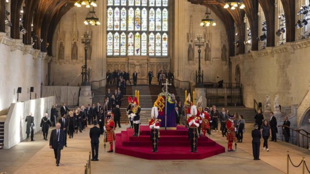 El féretro de la reina Isabel II yace en el centro de Westminster Hall sobre un catafalco púrpura colocado en una plataforma roja. Está cubierto por la bandera del Estandarte Real y rematado con la Corona Imperial de Estado colocada sobre un cojín, junto a una corona de flores.