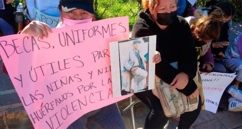En las pancartas se lee “Guanajuato violento. Familias de personas desaparecidas”, “Becas, uniformes y útiles escolares para las niñas y niños huérfanos por la violencia”, “Renuncia Jaime Rochin del Rincón. Incompetencia, no más simulación”, entre otras frases con las que exigen se cumplan las promesas de ayuda que les hicieron.