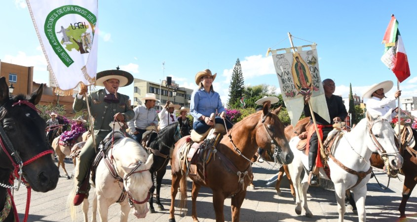 La presidenta municipal, Lorena Alfaro García participó en la Cabalgata que recorrió las principales calles de la ciudad hasta llegar a la plaza de Los Fundadores, donde se entregó a las autoridades municipales los estandartes y el fuego simbólico para su resguardo.