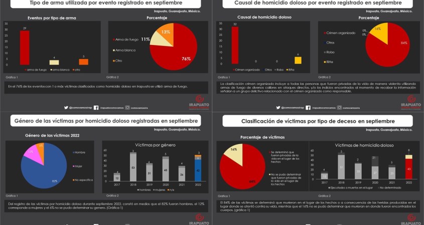 El reporte mensual de víctimas por homicidio doloso presenta la información condensada del registro de víctimas y eventos acontecidos en el municipio de Irapuato, Guanajuato.