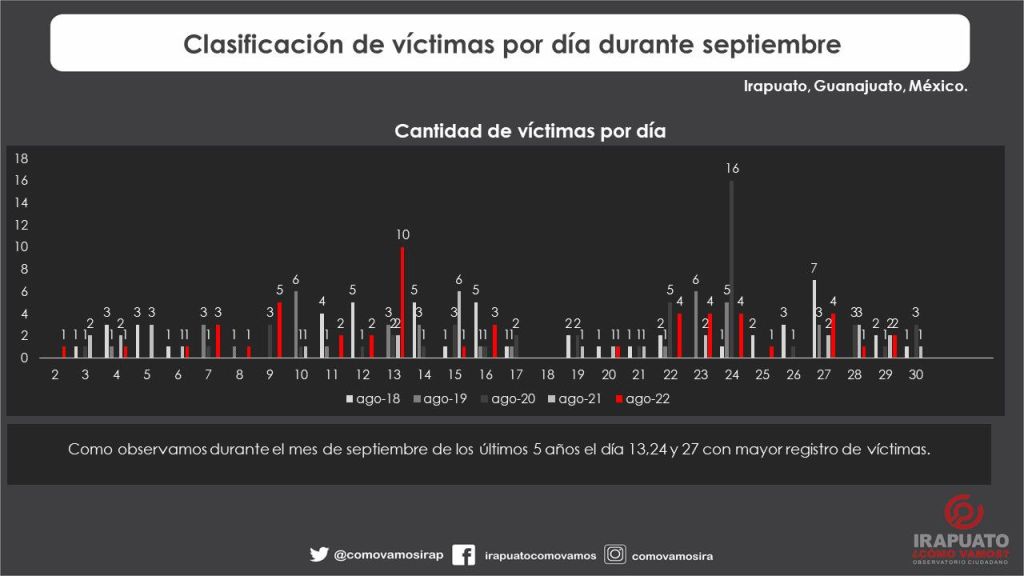 Durante septiembre 2022 acorde a nuestro registro de víctimas por homicidio doloso existió recuento de 38 eventos donde se registró un total de 51 víctimas.
