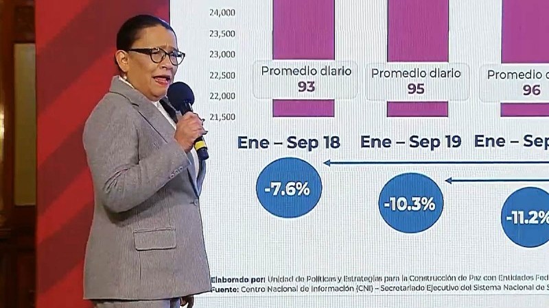 La secretaria de Seguridad y Protección Ciudadana (SSPC), Rosa Icela Rodríguez, afirmó que en México “hay una baja visible en la incidencia delictiva”, como en homicidios, secuestros y robos.