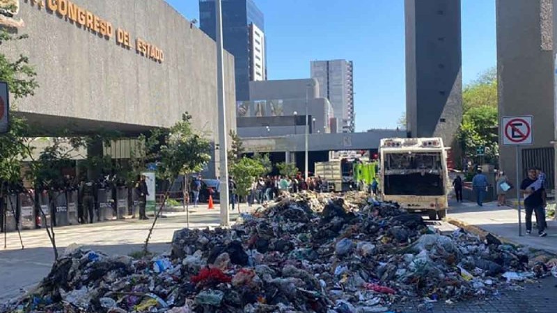 Trabajadores de Simeprode vaciaron este miércoles 26 de octubre basura en el Congreso de Nuevo León.