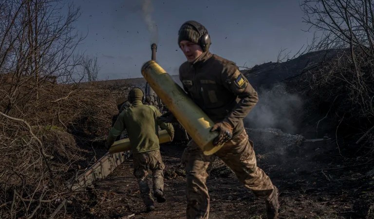 Un soldado ucraniano de una unidad de artillería dispara hacia las posiciones rusas en las afueras de Bakhmut, en la región de Donetsk. (Foto de BULENT KILIC / AFP)