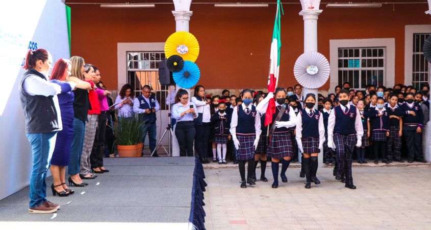 Lorena Alfaro García, presidenta municipal, felicitó a maestras y maestros de esta institución educativa por el compromiso que tienen en ir más allá de la enseñanza de las y los pequeños, pues están formando niñas y niños de bien, con valores, que en cada acto cívico recuerdan la historia de México y cómo el país salió adelante ante las adversidades.