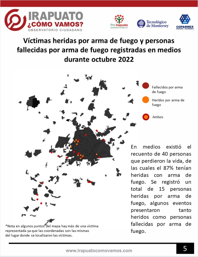 Irapuato, Guanajuato. Durante el mes de octubre se tuvo registro en Irapuato de que 42 personas perdieron la vida clasificada en homicidio, 40 clasificadas en doloso y 2 clasificadas en culposo.