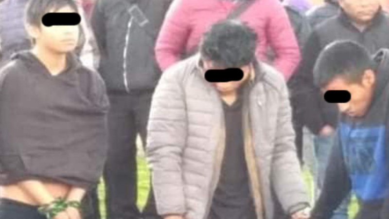 Pobladores de la cabecera municipal de Huixtán, Chiapas, mantienen amarrados y colgados a cuatro presuntos delincuentes, acusados de robar coches en la zona.