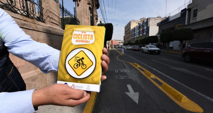 Para concientizar a personas ciclistas y peatones del Centro Histórico de la ciudad, personal de la Dirección de Movilidad y Transporte implementa los dispositivos de información de la campaña de Movilidad Activa, Sustentable y Segura.