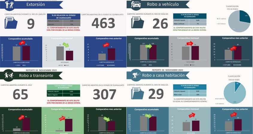 - Aumento de 8 delitos: (homicidio culposo 86%, Robo a vehículo .4%, Robo a casa habitación 16%, robo a transeúntes 1000% pasando de 1 carpeta registrada en el 2021 a 11 en noviembre 2022, violación 11%, Violencia familiar 13%, Narcomenudeo 12% y Lesiones dolosas 13%).