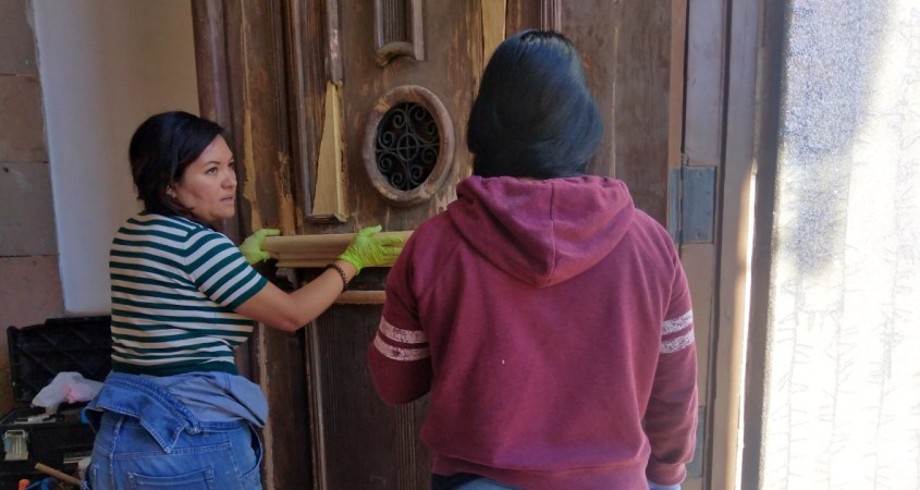 Con guantes, cubrebocas, pinceles y jeringas, entre otras herramientas, Dinora y Angélica inyectaron sustancias especiales orgánicas para fumigar el pórtico y eliminar las larvas que si evolucionan, terminarían con ella en poco tiempo al consumir la madera.