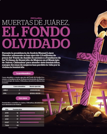 Aunque la violencia feminicida continúa cobrando víctimas en ese municipio fronterizo de Chihuahua, que adquirió notoriedad mundial durante la década de los 90 por haber sido el escenario de una serie de feminicidios y sus víctimas conocidas como las Muertas de Juárez, dicho Fondo ha sido utilizado escasamente durante este sexenio.