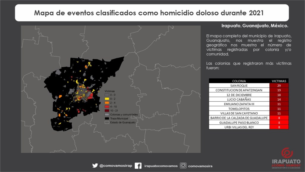 - Las 5 colonias y /o comunidades con mayor registro de víctimas fueron: San Roque 29, Constitución de Apatzingán 19, 12 de Diciembre 18, Lucio Cabañas 14, Emiliano Zapata III, Comunidad de Tomelopitos y Villas de San Cayetano con 11 víctimas cada una.