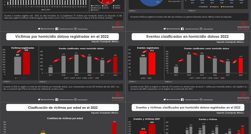 El reporte anual de víctimas por homicidio doloso presenta la información condensada del registro de víctimas y eventos acontecidos en el municipio de Irapuato, Guanajuato.