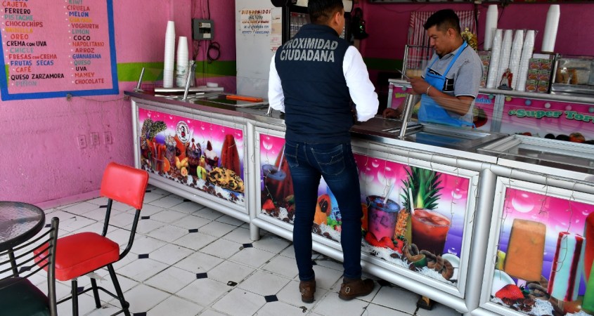 Mediante visitas a negocios y locales comerciales, personal de Proximidad Ciudadana comparte con ciudadanos y comerciantes recomendaciones y entregan volantes con información sobre las medidas de autocuidado para prevenir delitos; además de exhórtalos a denunciar en caso de ser víctimas de algún delito y pedir apoyo de las autoridades ante cualquier situación delictiva o de emergencia.