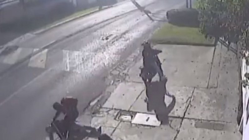 Mientras tanto el jóven sigue luchando con el hampón, quien en ningún momento se quita el casco, pero que ante la acción del joven no tuvo respuesta.