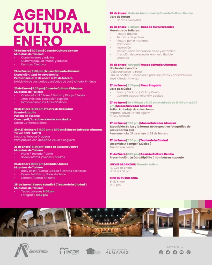 Para el disfrute de las y los irapuatenses, el Instituto Municipal de Cultura, Arte y Recreación (IMCAR), realizará actividades culturales en el Museo Salvador Almaraz, Andador Juárez, Casa de la Cultura del Centro y Teatro de la Ciudad del 23 al 31 de enero.
