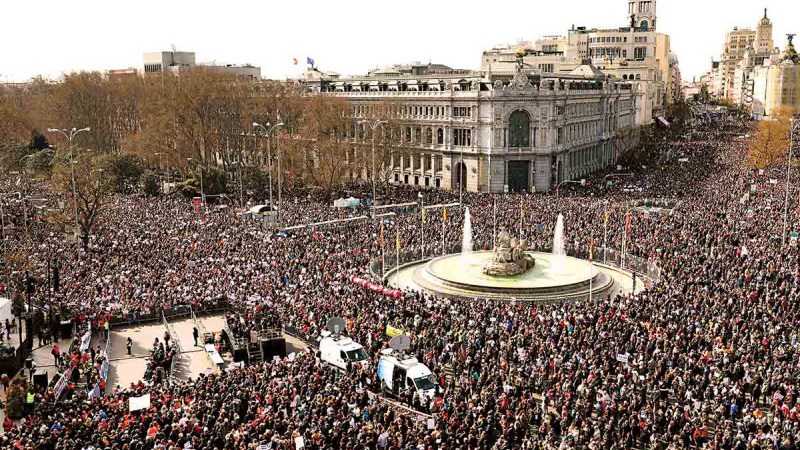 Los manifestantes llenaron la Plaza Cibeles, en el centro de la ciudad, con cánticos y ondeando banderas.