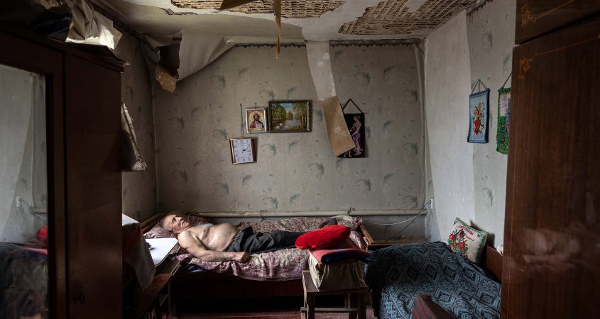“Un día estaba volando mi dron y haciendo fotos de la destrucción generalizada de un barrio de Hostomel, situado en una antigua línea del frente en las afueras de Kiev. Desde el aire, observé que alguien sacaba pertenencias de una casa gravemente dañada. Así que aterricé el dron, me acerqué a la casa y me reuní con Oksana. Me condujo a través de la escalera en ruinas de su casa hasta el desastre que había sido el piso superior de su casa. Parecía que había sido alcanzado por un tornado, pero no, dijo que había sido un cohete ruso. Su madre y su abuela estaban en casa en ese momento, pero sobrevivieron. Ahora estaba recogiendo lo que pudo salvar. La franqueza y la naturalidad con que contó la historia de su familia me impresionaron. Sin hipérboles ni melodrama, solo los hechos”.