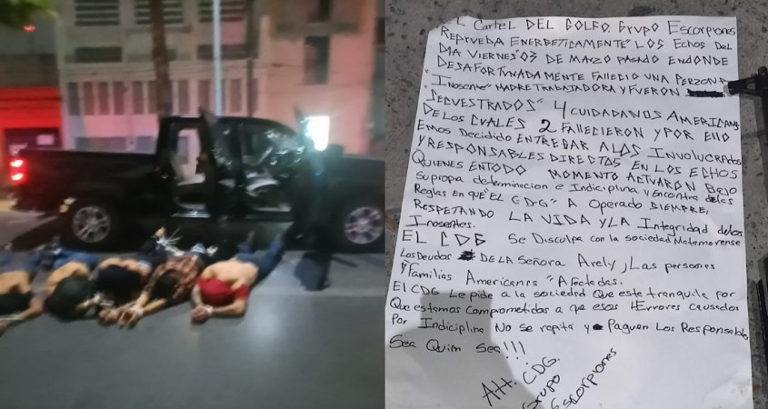 “El Cártel del Golfo, Grupo Escorpiones, repueba energéticamente los hechos del día viernes 3 de marzo pasado, en donde desafortunadamente falleció una persona inocente madre trabajadora y fueron secuestrados 4 ciudadanos americanos de los cuales 2 fallecieron, por ello hemos decidido entregar a los involucrados y responsables directos en los hechos, quienes en todo momento actuaron bajo su propia determinación e indisciplina”, decía la primera parte del mensaje hallado junto a los cinco hombres que aparecieron en una fotografía amarrados de las manos.