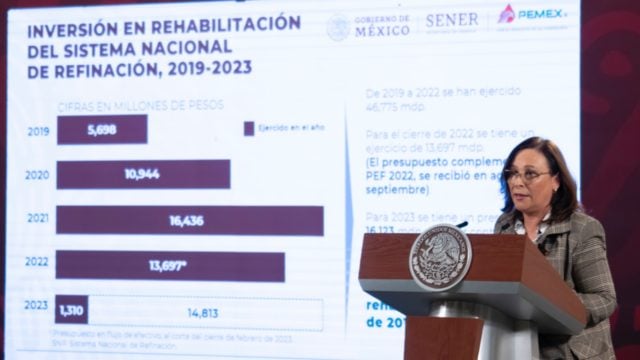 “Desde 2019 se inició programa de rehabilitación en las seis refinerías, limpieza de equipos y reparaciones mayores en equipos críticos. Esto es aparte del mantenimiento normal y de la operación de las refinerías. En 2021 fueron 127 intervenciones, en 2022 fueron 104, ahora en 2023 se tienen contempladas 39 reparaciones mayores y 186 menores”, detalló la funcionaria.