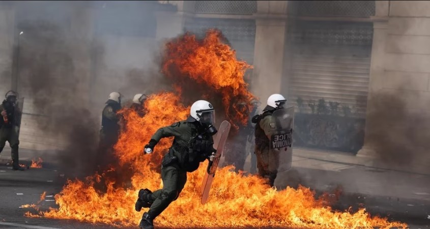La policía disparó gases lacrimógenos contra los manifestantes encapuchados que lanzaban bombas incendiarias y piedras cerca del Parlamento en la céntrica plaza Syntagma.