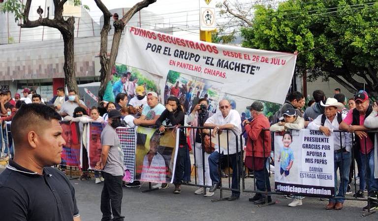 «Fuimos secuestrados desde el 26 de julio del 2021 por el grupo El Machete, en Pantelhó, Chiapas», reza la leyenda escrita en la lona. Desde esa fecha, acusan que no hay justicia, aunque a finales del 2022 la Fiscalía General del Estado ofreció una recompensa de 500 mil pesos para quien de informes que genere la localización de los 18 desaparecidos.