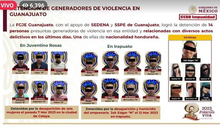 Explicó que las ocho personas que fueron detenidas el 13 de marzo durante un operativo implementado en la colonia Las Reynas pertenecían a la organización criminal de Jalisco; a ellos se les señaló en la misma mañanera como los presuntos autores del secuestro y asesinato del empresario Jair Martínez.