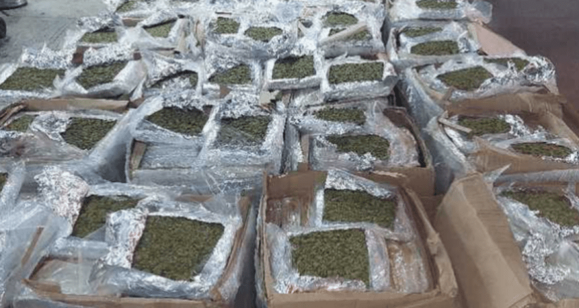 Los elementos de la Guardia Nacional inspeccionaron las 20 cajas de cartón y localizaron en su interior envoltorios cubiertos con papel aluminio que contenían hierba verde y seca con las características propias de la marihuana, con peso aproximado de 900 kilos.