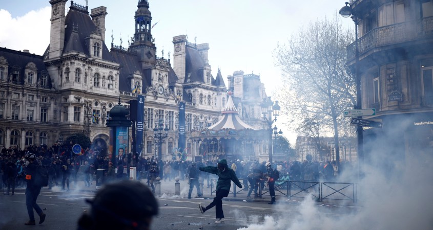 Manifestantes opuestos al impopular plan del presidente de Francia, Emmanuel Macron, para subir la edad de la jubilación marcharon el jueves por ciudades y pueblos del país y se enfrentaron a la policía en una demostración final de ira antes de conocer un fallo sobre si la medida cumple con la Constitución.