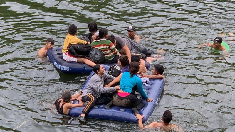Para poder lograrlo usaron inflables, salvavidas, lianas, algunos de plano sin ninguna protección. Poco les importa si personal de la Guardia Nacional o del Instituto Nacional de Migración estaban presentes.