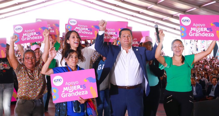 El gobernador de Guanajuato, Diego Sinhue Rodríguez Vallejo, le alzó la mano a la titular de la Sedeshu, Libia García Muñoz Ledo, durante la presentación de la tarjeta “MujerEs Grandeza”, evento al que asistieron cerca de 25 mil mujeres de todo el estado.
