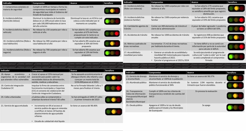 • 7 compromisos se encuentran en semáforo rojo (con retroceso, sin avance o avance parcial)