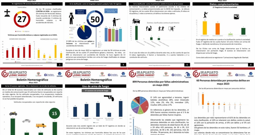 Irapuato, Guanajuato. Durante el mes de mayo del 2023 se registró en medios de comunicación que 27 personas perdieron la vida clasificada en homicidio, 24 clasificadas en doloso y 3 en culposo.