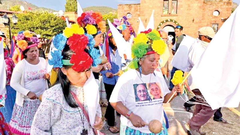 Indígenas rarámuri danzaron en la iglesia de Cerocahui —donde hace un año fueron asesinados a tiros los sacerdotes jesuitas Joaquín César Mora Salazar y Javier Campos Morales —y participaron en una misa donde se repicaron constantemente las campanas, mientras eran resguardados por un centenar de policías estatales, militares y guardias nacionales.