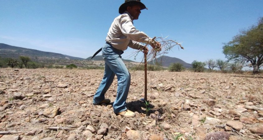 Mientras la represas de San José de Mendoza y El Huaricho están a punto de secarse, don Nemesio Quintana, agricultor de temporal de la comunidad Meza de los Aguirre, se aferra a su talacho-pico para limpiar su parcela llena de piedras, esperando que llueva pronto para poder sembrar su maicito y es que dice: