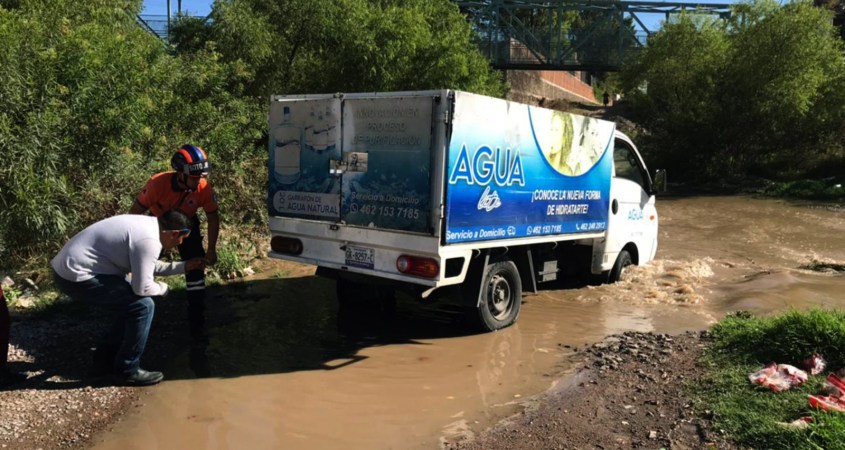 Elementos de Protección Civil rescataron a ocupantes de una camioneta repartidora de agua que se quedaron atorados en la corriente del río Silao, luego de intentar cruzar del fraccionamiento Los Cobos a la colonia Bellavista; afortunadamente los ocupantes resultaron ilesos.
