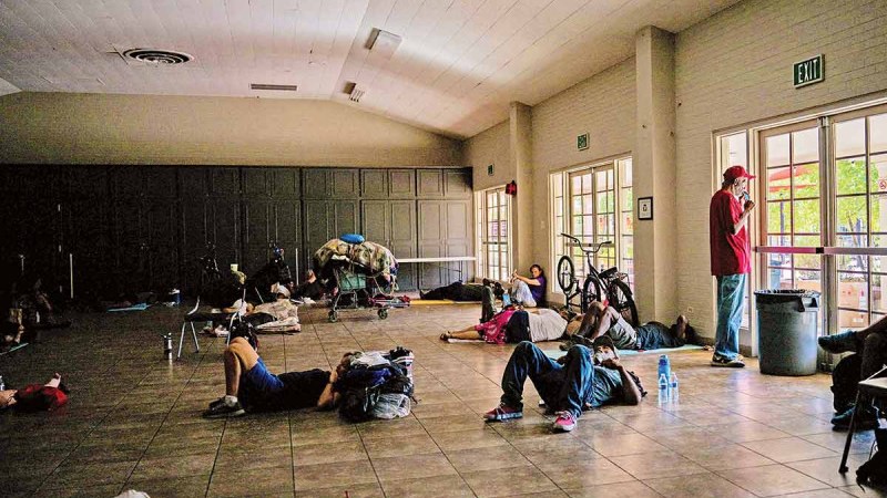 En el templo, las personas pueden tomar botellas de agua y acostarse sobre tapetes o directamente sobre el piso.