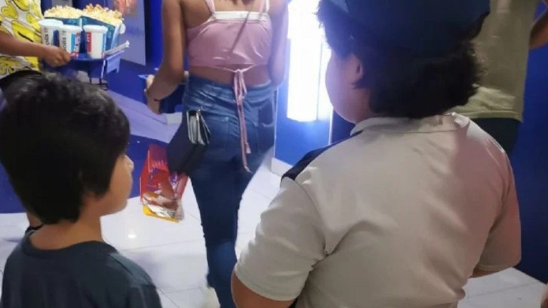 La mujer contó que la mamá de los pequeños se salió a media película y ya no regresó por sus hijos.