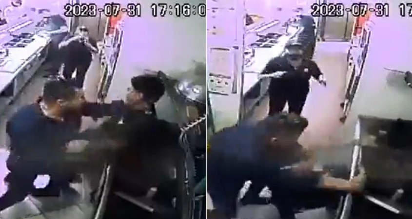En el clip se observa a un trabajador en un área restringida para los clientes, donde se preparan los alimentos solicitados. A unos cuantos metros se encontraban dos de sus compañeros que sobresalen por su uniforme de color negro. Mientras el joven de 15 años se encontraba apoyado en una tarja de cocina, un sujeto de camisa azul irrumpió violentamente para atacarlo.