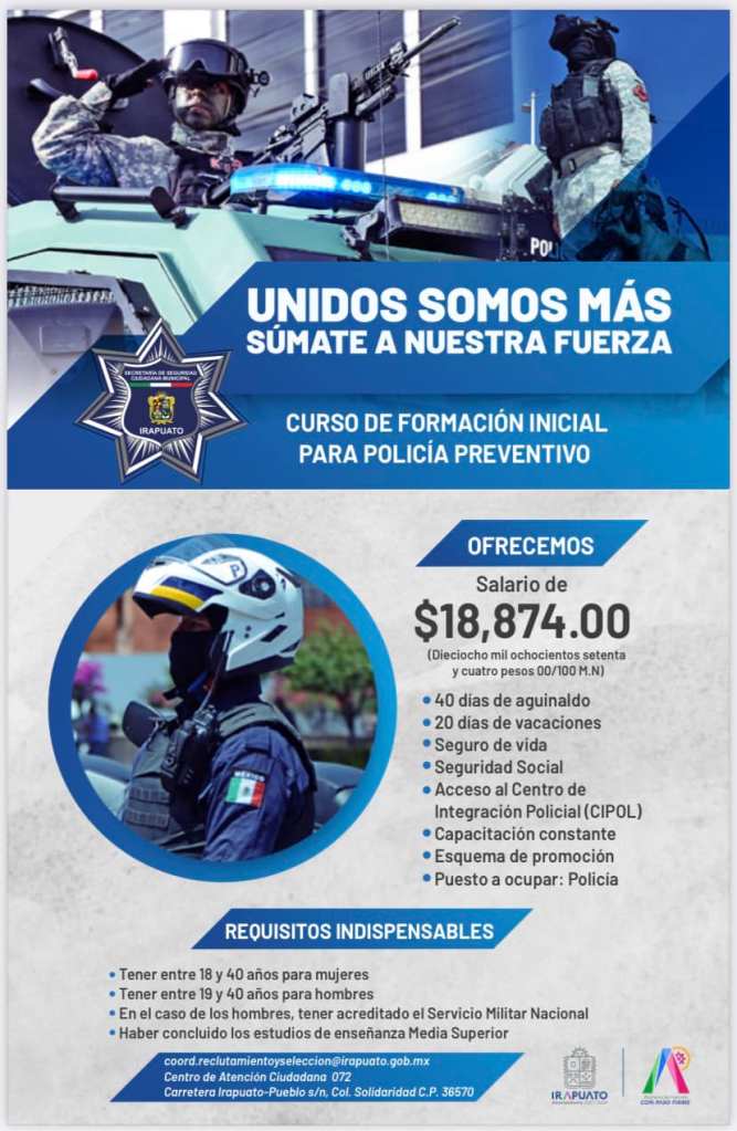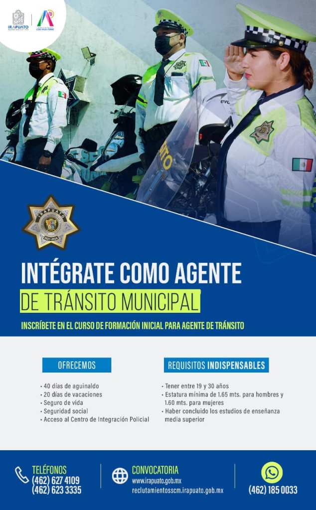 La Secretaría de Seguridad Ciudadana de Irapuato convoca a las y los irapuatenses que cuenten con vocación de servicio e interés en desempeñar cargos públicos, a postularse en las convocatorias 2023 para el curso de Formación Básica de Policía Preventivo y Agente de Tránsito.